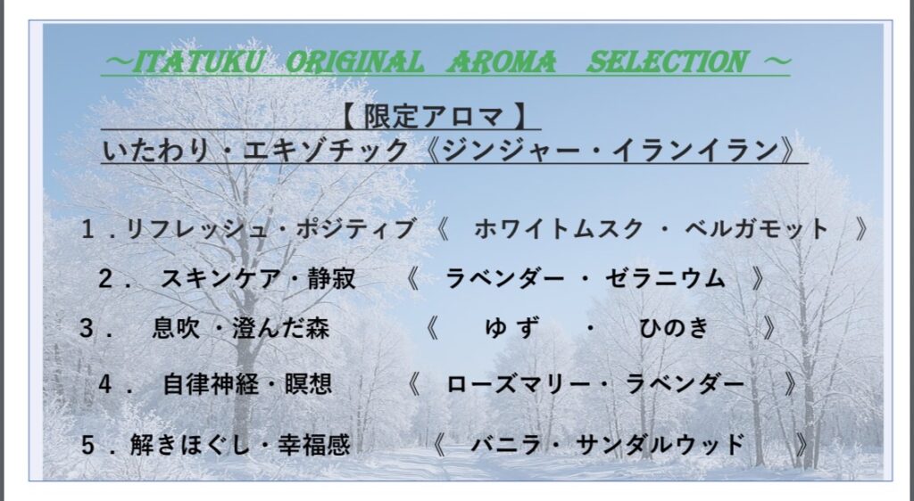 そんな冷え込む季節に、少しでも羽を伸ばして温まっていただけるよう、このたび冬季限定のアロマブレンドを新しくご用意いたしました。